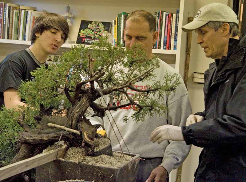 On the first day the object was to learn what to do with very old and very large junipers at this time of the year. They were all Rocky Mountain Junipers, many hundreds of years old and of exceptional quality. The students learned hands on how to repot such monsters, when to do that and when not, how to do rough designs at an early stage. How to find the best position in a reasonable training pot. As one can see it was a lot of dirt an fun. the usual Harrisburg massacre.